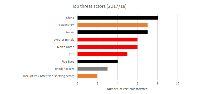It's probably no surprise to find China heading the 2017/18 ranking of threat actors, in terms of capability, potential impact and number of verticals targeted: