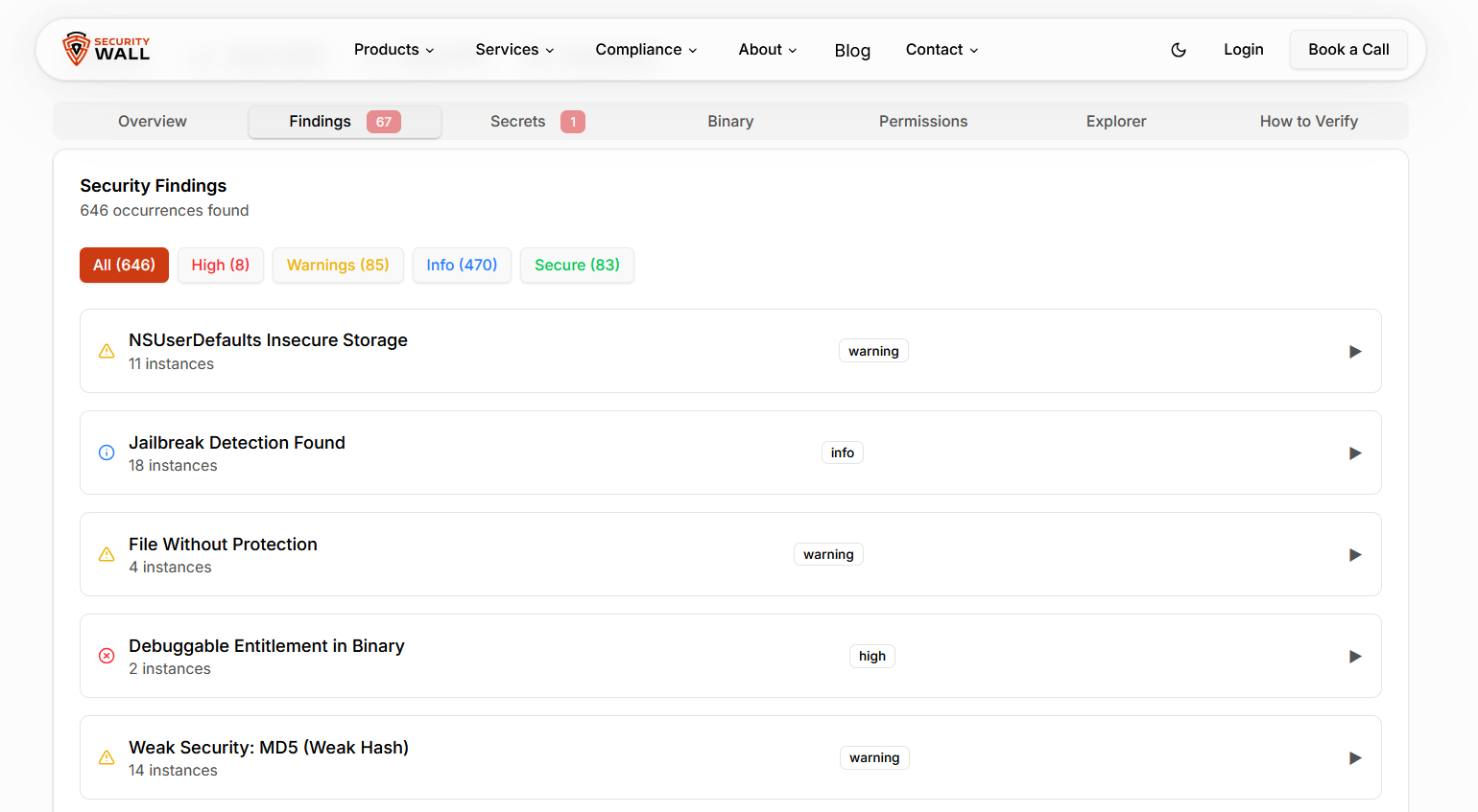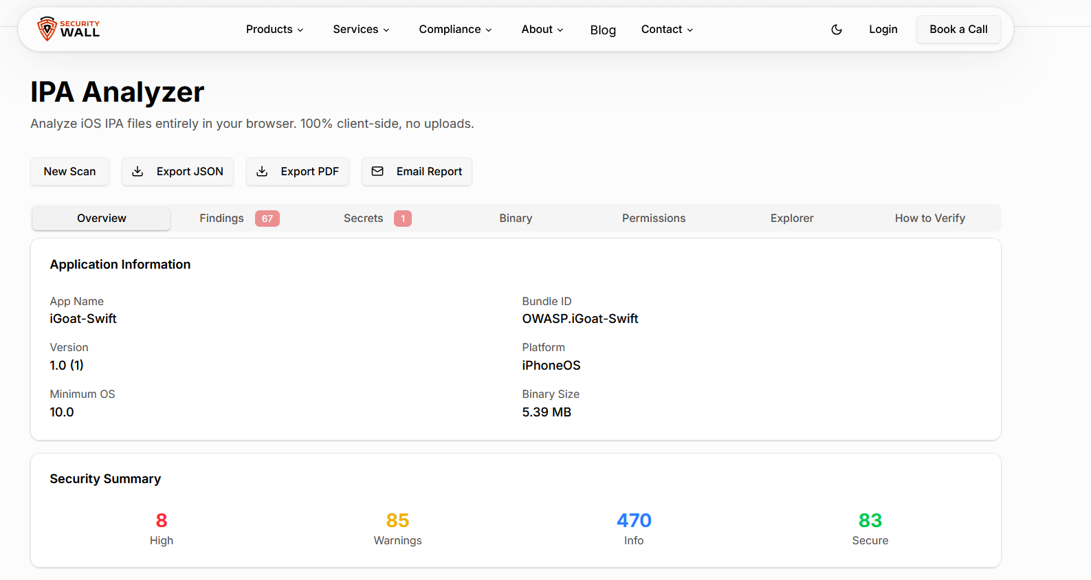 A modern solution like the SecurityWall Powered IPA Analyzer provides immediate visibility into security-relevant issues directly from the IPA file.