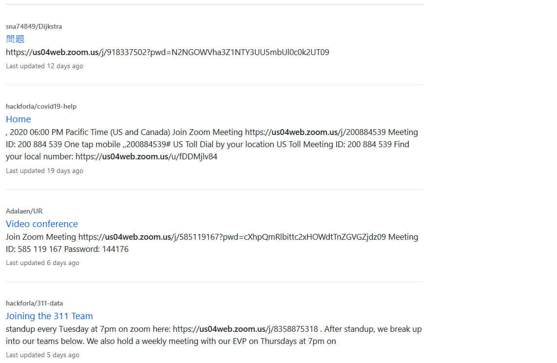 Many meetings were disturbed as Zoom meeting links were disclosed and index in Google where attackers used them to disturb meetings but when it comes to high numbers of users attackers can join through these URL's and sit back and listen to your private talk as in high number of users attacker can play disguise. Hackers would just need to generate a list of 9, 10, or 11-digit meeting IDs, and check whether they were valid or not. If they got a hit, the spies could then eavesdrop on the conferences, and access all the video, audio and documents shared throughout the sessions, although this was only if no password were set. Beside all many Zoom meetings were disclosed on Github and these links dont require passwords to join these meetings.
